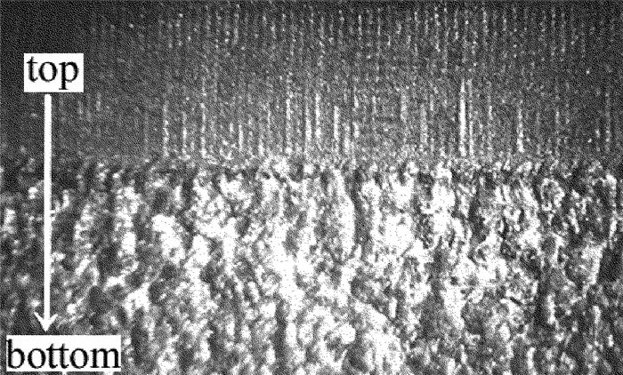 圖 7為不同頻率下縫寬和錐度的變化曲線。其中激光功率20W,切割速率30mm/min,脈沖頻率分別為30Hz, 40Hz, 50Hz, 60Hz。從圖中看出,激光脈沖頻率對切縫寬度影響大。隨著頻率的增大,縫寬顯著減小,同時切割錐度也隨之減小。脈沖頻率的大小決定著激光光斑的重疊程度,圖 8為PCBN激光切割、掰片、簡單去熔渣后斷面形貌圖。上層為PCBN,下層為硬質(zhì)合金。圖中能明顯看出切割后的條紋形狀。根據(jù)單脈沖激光能量E與平均輸出功率Pave和脈沖頻率f的關系式E=Pave/f可知,隨著脈沖頻率的增加,單脈沖能量減小,光斑重疊度增大,這對表面切割質(zhì)量的提高和裂紋的減少起著重要作用。