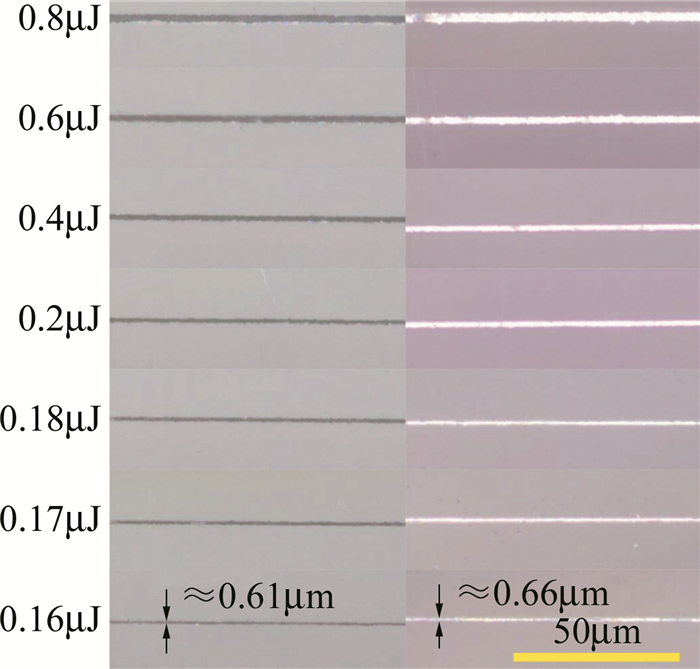 激光直寫刻蝕玻璃方法,按激光波長不同主要分為紅外和紫外激光刻蝕法,而按照激光脈寬不同則可分為:連續激光刻蝕;納秒、皮秒及飛秒激光刻蝕。YANG等人使用248nm深紫外準分子激光在石英玻璃表面刻蝕微通道,試驗中發現激光能量密度是決定石英玻璃發生刻蝕及裂損的主要因素,無裂損刻蝕石英玻璃的激光能量密度閾值區間應在16J/cm2~30J/cm2;而掃描次數的增加、重復頻率和微通道深度的增大也會加劇微通道的裂損程度,最后通過加工參量的優化(激光能量密度23.5J/cm2,圓弧段重頻為50Hz,直線段重頻為40Hz,掃描1次)實現了寬度小于100μm的直線型(深度不大于50μm)和圓弧型微通道(深度不大于28.5μm)的無裂損刻蝕。LI等人利用波長為355nm, 脈寬為10ns~25ns的全固態紫外激光器直寫刻蝕BF33硼硅玻璃微通道,試驗中采用單一變量法探究激光能量密度、重復頻率、掃描速率等參量對刻蝕效果的影響,試驗結果表明,當激光能量密度過大時,玻璃易發生嚴重崩邊裂損現象,刻蝕深度減小;而隨著重復頻率的減小,通道碎裂現象減輕,刻蝕深度增大。YU等人采用波長為1030nm、脈寬和重復頻率分別為290fs, 50kHz的飛秒激光器在石英玻璃樣品上刻蝕線寬小于1μm的凹槽圖案以制備亞微米金屬線,研究了不同脈沖能量激光與燒蝕凹槽及機械拋光后的金屬線的線寬之間的關系,如圖 1所示。結果表明,當脈沖能量在0.18μJ以下時,凹槽線寬已降低至1μm以下,最終在石英玻璃上制備出多種不同圖案且線寬穩定控制在0.8μm左右的凹槽。
